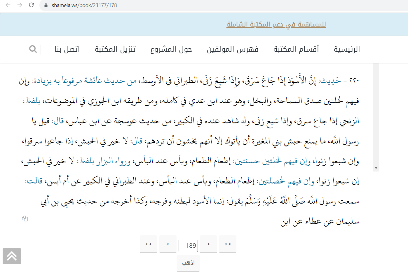 Черный (негр), когда он голоден, ворует, а если сыт, то прелюбодействует. Ат-Табарани в книге «Аусат» приводит хадис от Айши с добавлением: «И есть в них две черты: правдивое снисхождение и скупость». И это приводится у Ибн Удейя в его «Камиле» и по его пути у Ибн Джаузи в «Маузуат» в таком виде: «Негр, если он голоден, то ворует, а если он сыт, совершает прелюбодеяние». И это подтверждается также в «Кабире» в хадисе Аусаджа со слов Ибн Аббаса, что Посланнику Аллаха (С) сказали: «Что мешает неграм (эфиопам) из Бану Мугира прийти к тебе, кроме того, что они боятся, что ты отправишь их назад?» Он сказал: «Нет добра в неграх (эфиопах): если они голодны, то воруют, а если сыты, то прелюбодействуют. Но у них есть две хорошие черты: кормление пищей и сила в бою». Баззар также передал этот хадис в такой форме: «Нет ничего хорошего в неграх (эфиопах): если они будут голодны, они будут прелюбодействовать, но есть в них две черты: кормление пищей и сила в бою».