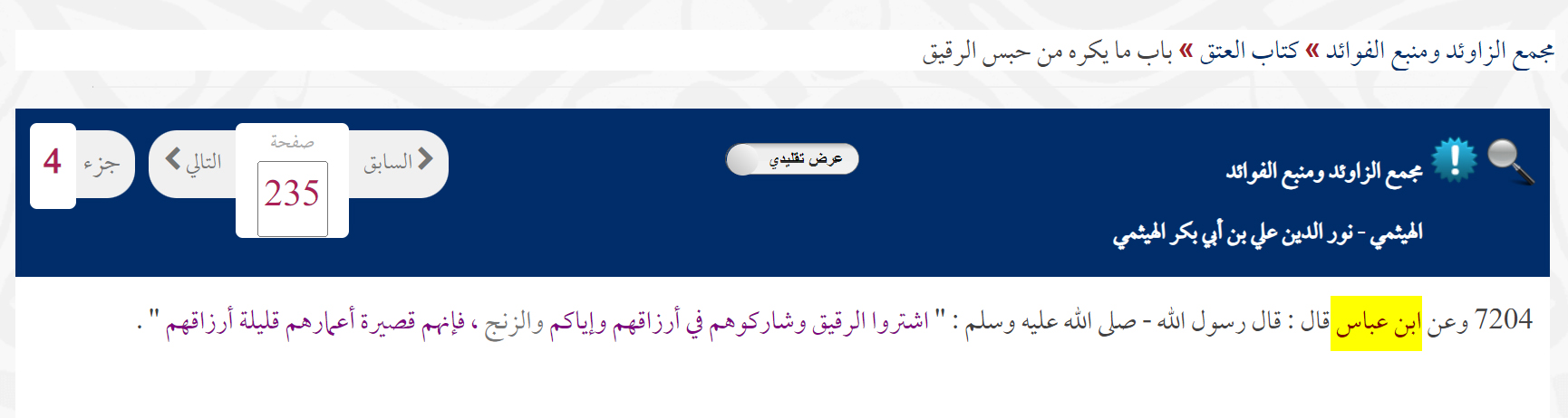 От Ибн Аббаса, что Посланник Аллаха (С) сказал: «Покупайте рабов и будьте участниками в их ризке. И избегайте негров (зинджей), ибо срок их жизней краток, а их ризк мал».