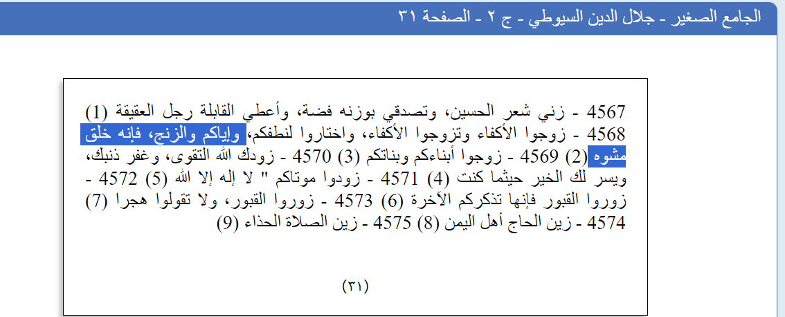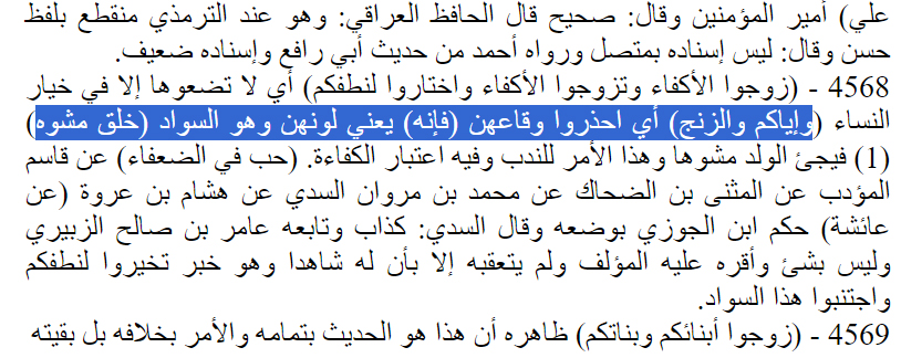 عن عائشة ان رسول الله قال زوجوا الأكفاء واختاروا لنطفكم، وتزوجوا الأكفاء، وإياكم والزنج! فإنه خلق مشوه.