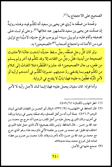 «Если бы из-за того, что один человек назвал другого слабым, хадисы от него были бы отброшены, то тогда мы потеряли бы большинство хадисов “сахих”. Практически нет достоверного передатчика, о которых кто-либо не сказал бы, что он – слабый, и не было бы нападок на него».