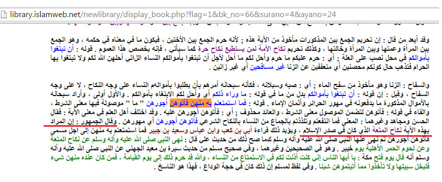 «Учёные разошлись в значении этого аята. Хасан и Муджахид сказали: “Его значение – удовольствие от женщин в шариатском браке”, а слова “и давайте им их плату” означают махр. Однако большинство учёных сказали, что тут имеется в виду никях мута, который имел место в начале Ислама. И на это указывает чтение этого аята Ибн Аббасом, Аби ибн Каабом и Саидом ибн Джубейром: “А то удовольствие, которые вы получили от них на определённый срок, — давайте им за него их плату”».