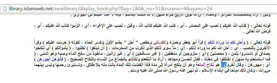 «“А за то удовольствие, которое вы получили от них” – относительно значения этих слов есть расхождение, и Хасан и Муджахид сказали: “Имеется в виду получение удовольствие в правильном браке” — “давайте им их плату” – то есть махр. И сказали другие: “Тут имеется в виду никях мута, которая заключается в том, что он женится на женщине на срок, а когда заканчивается срок, оставляет её без развода”»