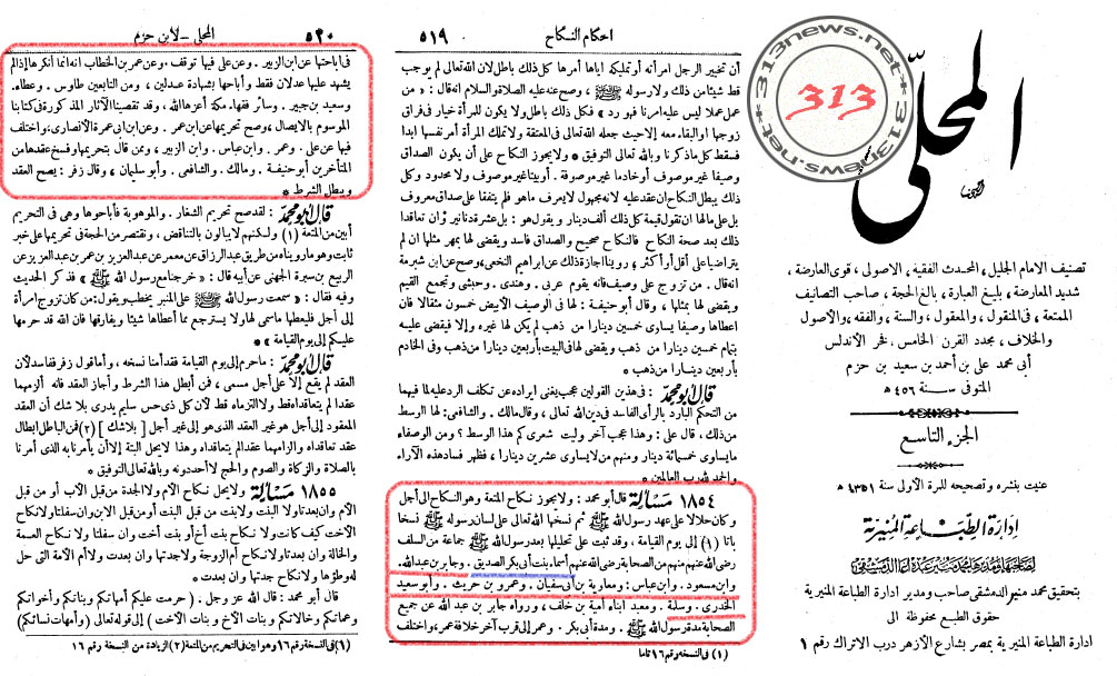 «Абу Мухаммад сказал: не разрешён брак мута, то есть брак, заключаемый на срок. Однако он был разрешённым во время Посланника Аллаха (С), а потом Аллах отменил его языком своего Пророка (С), и этот запрет действует до Судного Дня. Однако его разрешённость после смерти Посланника Аллаха (С) была установлена множеством предшественников (саляфов), и в их числе такие сахабы, как Асма бинт Аби Бакр, Джабир ибн Абдиллях, Ибн Масуд, Ибн Аббас, Муавия ибн Аби Суфьян, Амру ибн Хурейс, Абу Саид Худри и Салама. И хадис от Джабира ибн Абдилляха говорит обо всех сахабах (что они совершали муту) во время Посланника Аллаха (С), Абу Бакра и Умара, вплоть до конца его халифата. И есть расхождение в её дозволенности от Ибн Зубейра и от Али, и от самого Умара ибн Хаттаба, так как он и отверг её (муту). И из табиинов (признавали и делали муту): Тавус, Ата, Саид ибн Джубейр и другие факихи Мекки, да возвысит их Аллах!»
