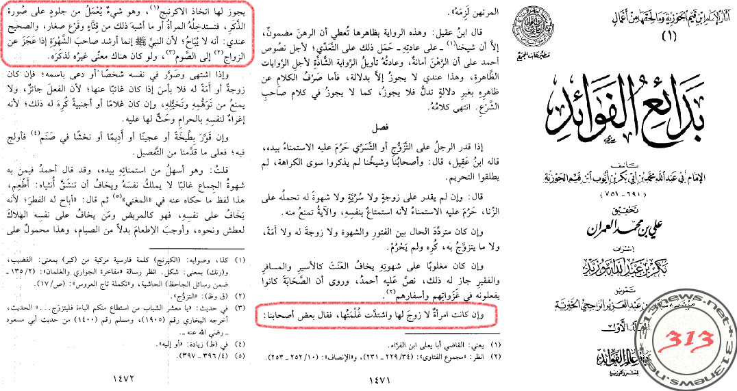 «Если у женщины нет мужа, и ее одолела страсть, то некоторые наши асхабы (то есть ученые ахлу сунна) сказали: “она может использовать искусственные средства самоудовлетворения” – и это может быть некой вещью в форме полового члена мужчины, так что женщина вводит его в себя, или то, что похоже на это, как, например, огурец (!!!) или маленькая тыква (!!!)».